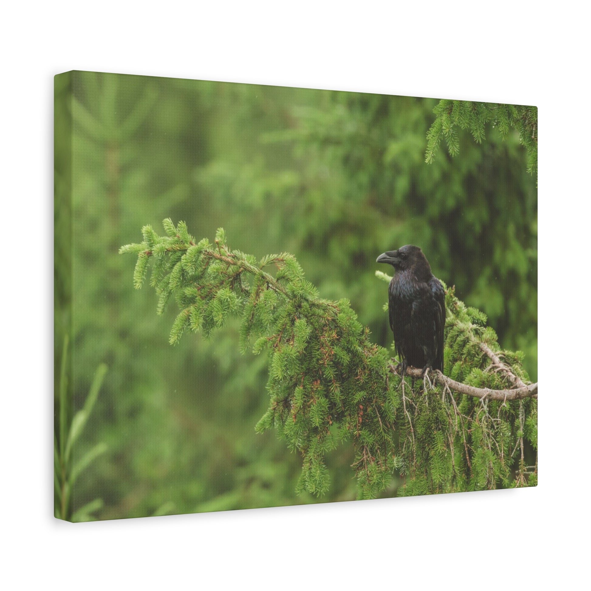 This matte stretched canvas brings a quiet, wild moment into the home. A lone raven sits on a mossy fir branch, softened by a luminous, green background — like a breath of old forest air on the wall. The subtle matte finish tames glare and deepens the rich greens, while the 1.25" radial pine stretcher gives the scene a gallery-ready presence without overwhelming the image. Hang it above a console or lean it on a bookshelf to add a thoughtful, nature-forward accent to a living room, study, or cabin nook.